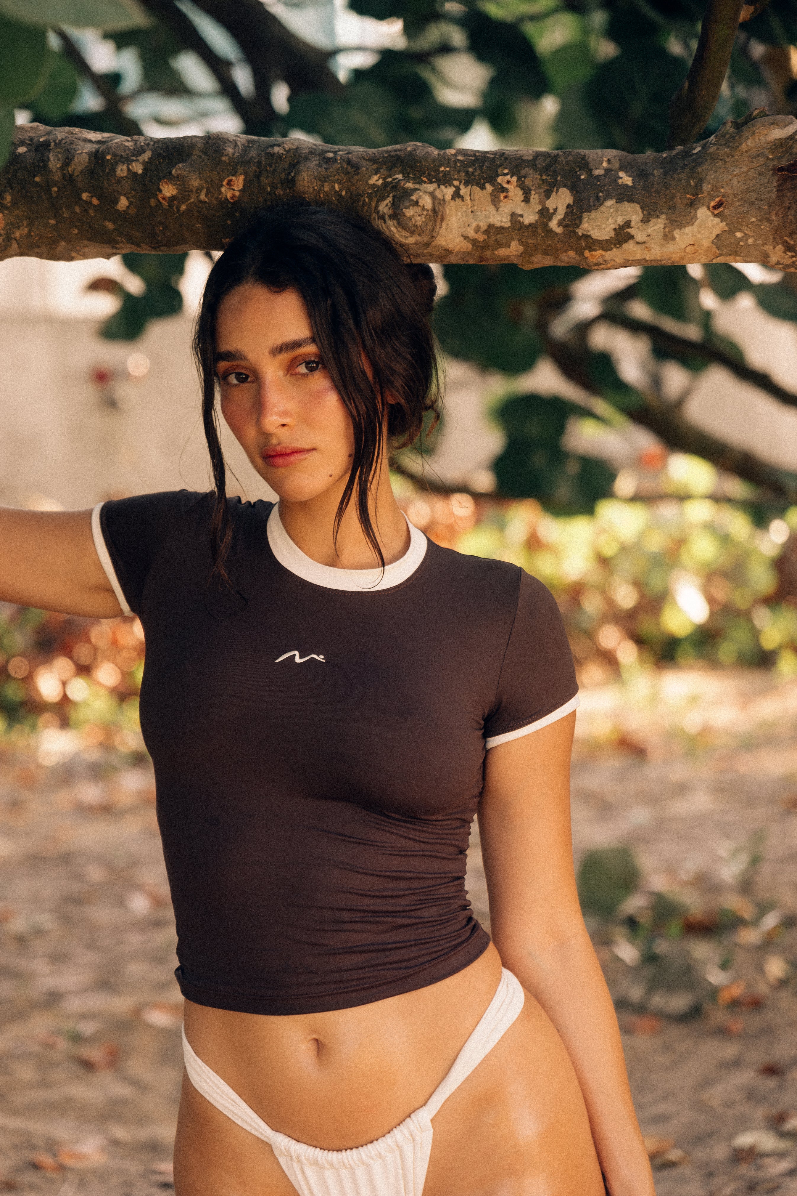 Your new work-from-home, girl errand, lazy day, everyday outfit has entered the chat. The 90s did it better so we had to bring in the baby tee silhouette - not quite cropped, not quite full length, yet every bit of stylish. Featuring a contrast detail and embroidered logo. Whether you're on the go, or chillin', you won't want to take Rhodes off. This is comfort, elevated. Designed to be worn in and out of water.