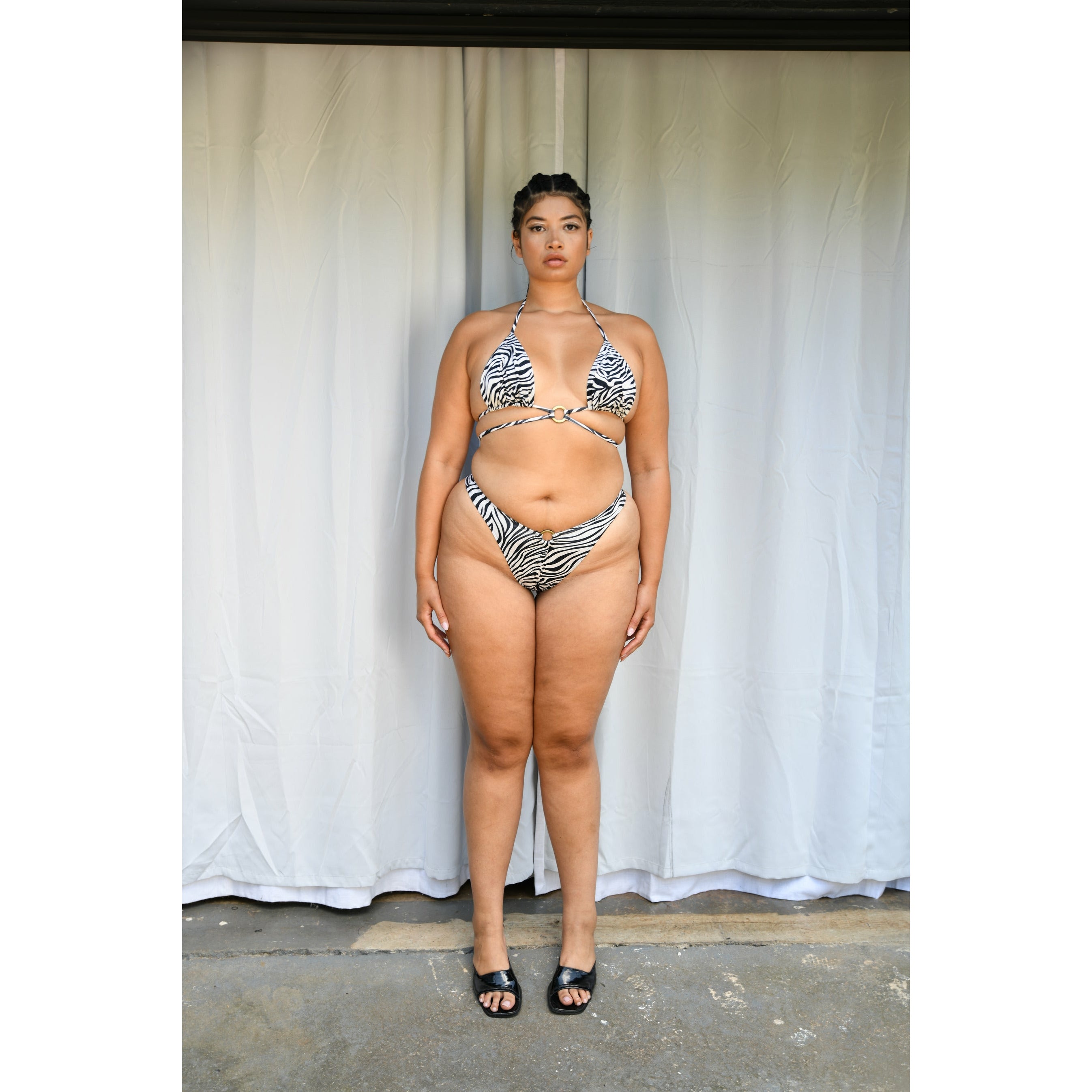 The epitome of tan lines matter. The EDEN top is our take on the traditional triangle bikini. Featured in our exclusive neutral and textured zebra print, with vintage gold hardware, and double the strings for double the fun. Paired with the EDEN bottom.